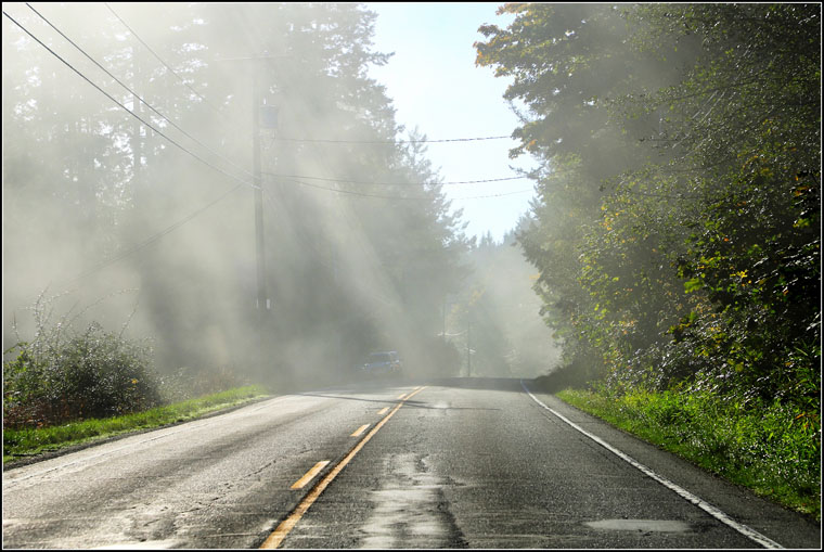 foggy morning the school bus strobes were strobing while the rising sun was probing the fog banks highway robbery along the fulford ganges road