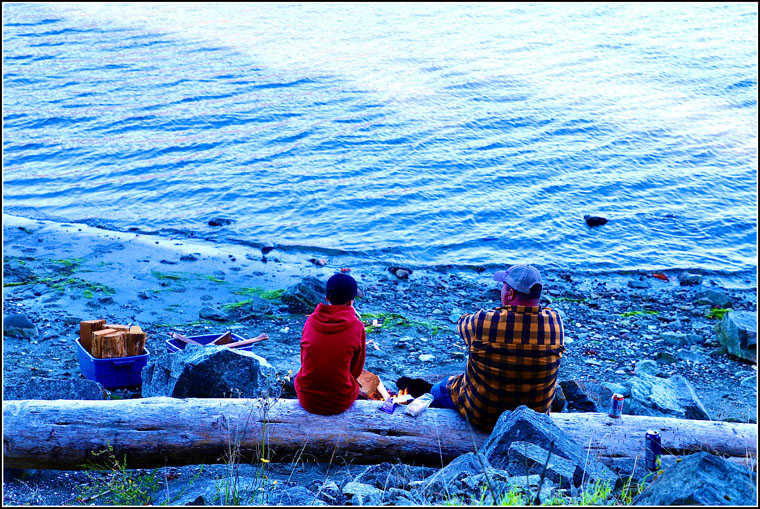 a son and his dad enjoying a fire on the shore of fulford harbour on a chilly day as summer is almost done how sweet it is two bumps on a log