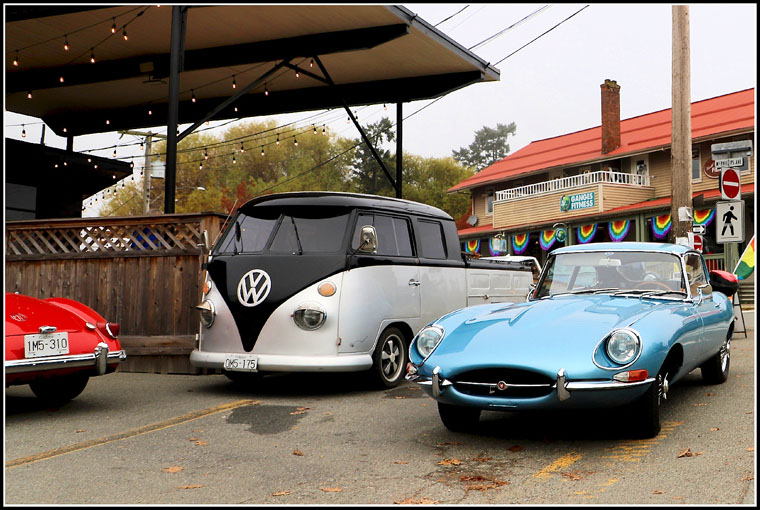 three beauties an mg and a vw and a jaguar xke at a friday the 13th rally at ‘cassette café and dive bar’ just this morning ok i admit it i like old cars