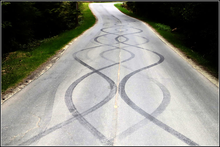 burnout art on beaver point road could only be created by a very skilled driver to result in the perfect symmetry in the pattern left by smoking squealing tires