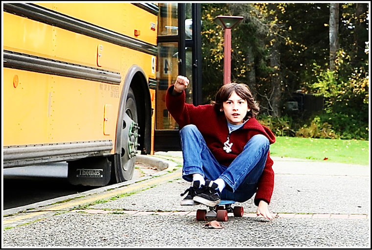 there's remy lowboarding between schoolbus rides believe it or not remy is short for remington and his family name is steel therefore here you have one remington steel