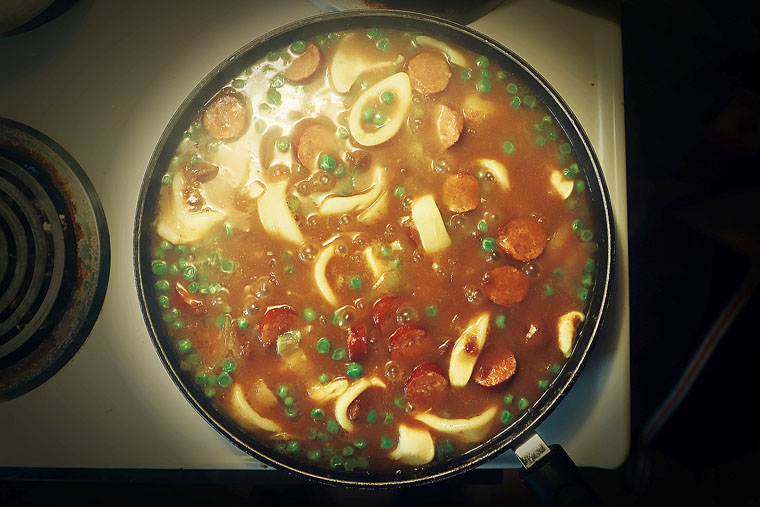 saturday morning bubbling cauldron of curry with squid potatoes and peas mennonite sausage garlic and onion autumn comfort in a skillet for breakfast lunch and dinner