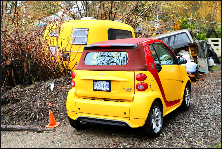 after so many dull monochrome fotos today i opted for a splash of colour that i found here in my lee road community with harry's smart car and boler trailer