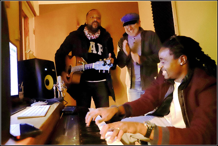 adonis puente and jose sanchez and producer/keyboardist david labrada in jose's salt spring studio as they work/play on overdubs on adonis' forthcoming album