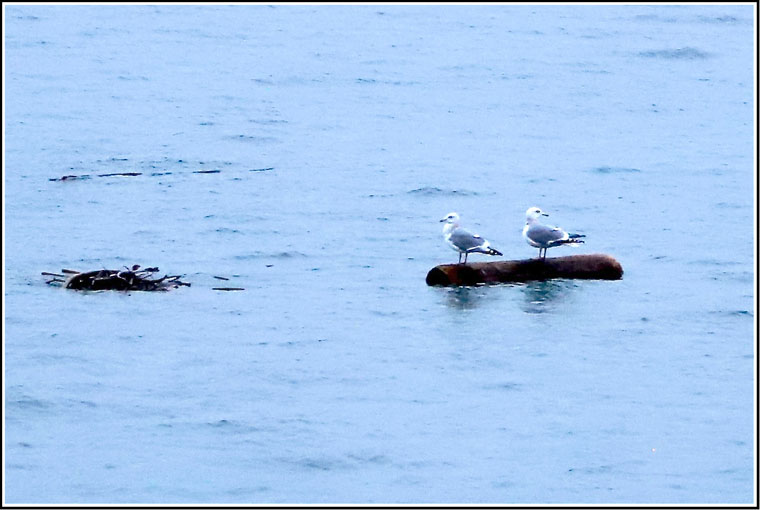 gordie and gertie identical twin gulls adrift in the pacific in the winter rain wondering if the blob that is dogging them will eat them or whether they will eat the blob