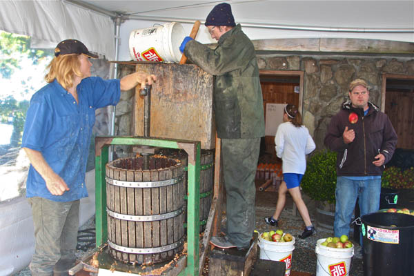 master juicer paul stirs it up while eric assists and kyle does his one apple juggling trick