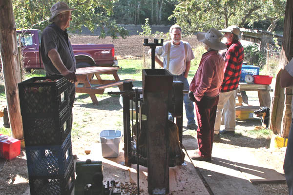 suspender pete regales appleheads as the juicers take a break in the barn in the middle of beddis road