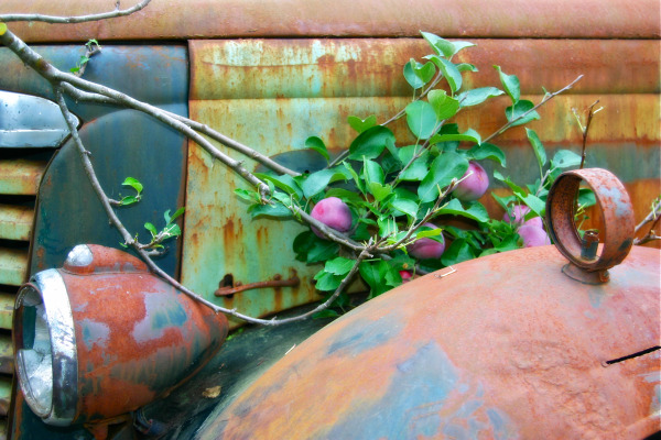 a limb heavy with ripe apples rests upon the fender of the old gmc just a few days before before the salt spring apple festival