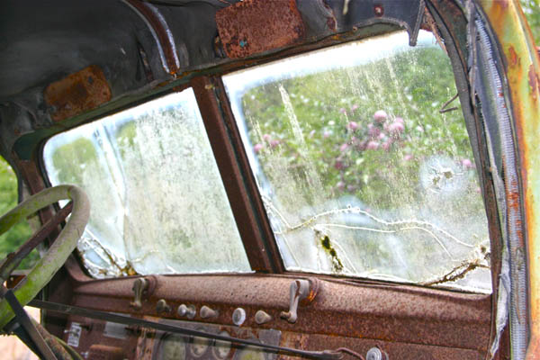 we can barely see the apple tree through the crusty windshield of this ancient truck in bruce's field on beaver point road