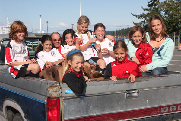 a truckload of saltspring's u12 soccer team returning home from a match on vancouver island